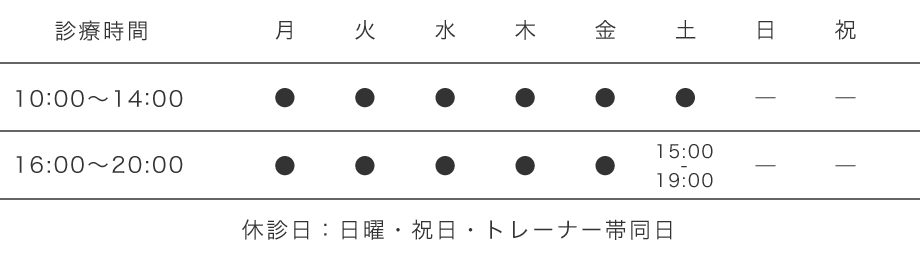 開業し5年以上、肩こりや腰痛、膝痛、スポーツ障害、姿勢矯正、骨盤矯正など様々な悩みがある患者様に多くお越しいただき、再発予防まで管理しているのが当院の特徴です。